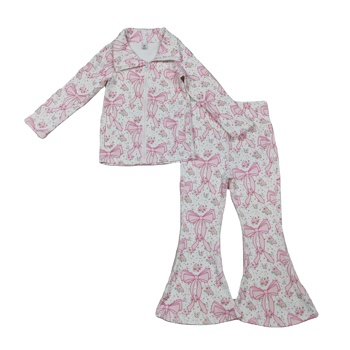 RTS Boutique Athletic Wear for Kids Flower Bows Zipper Coat Flared Pants 2 Pieces Outfits Yoga Wholesale Children's Outfits